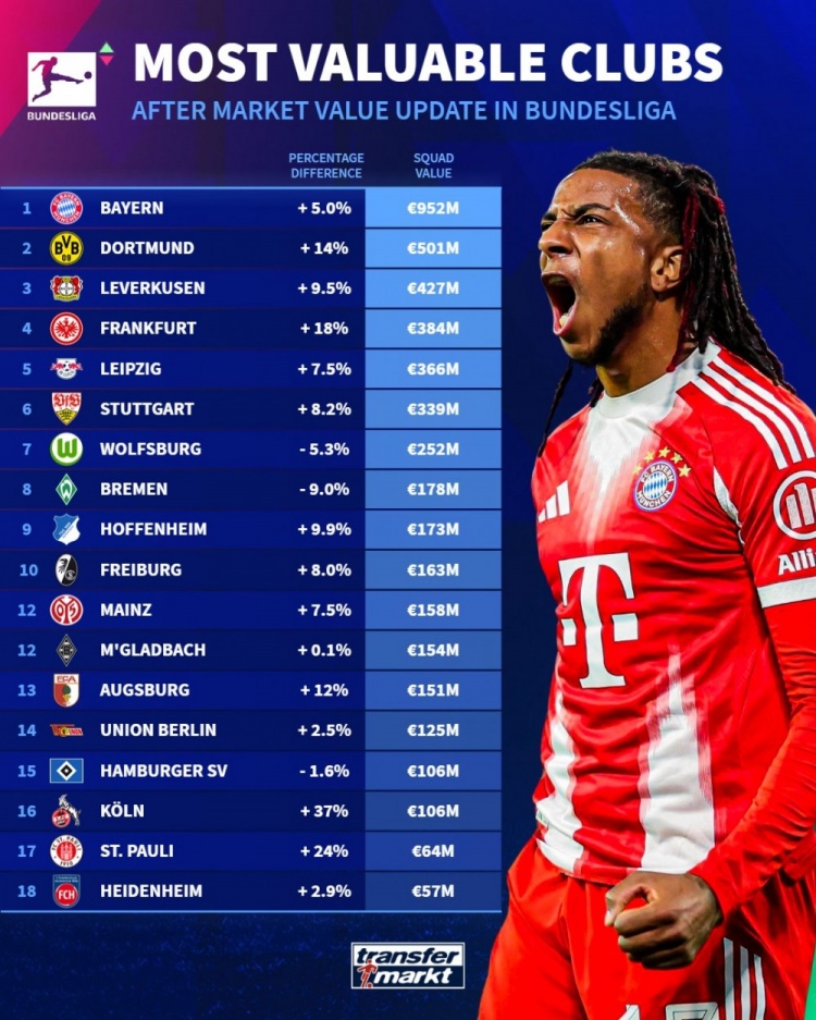 10月15日讯 德转更新了德甲身价,以下为更新后德甲各队身价排名: